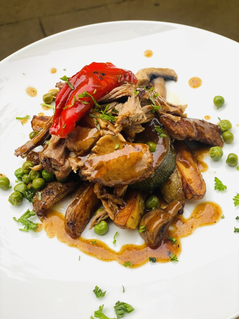 roasted potato wedges dredged in Chinese 5 spice and oil coating with lashings of the reduced cooking sauce